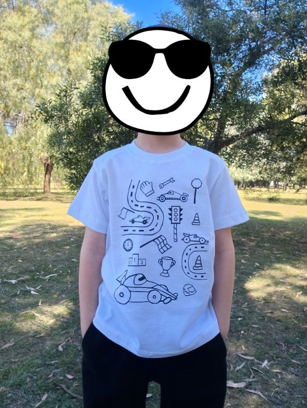 Remera mangas cortas 100% algodón con diseño para colorear de temática CARRERA. No incluye marcadores.